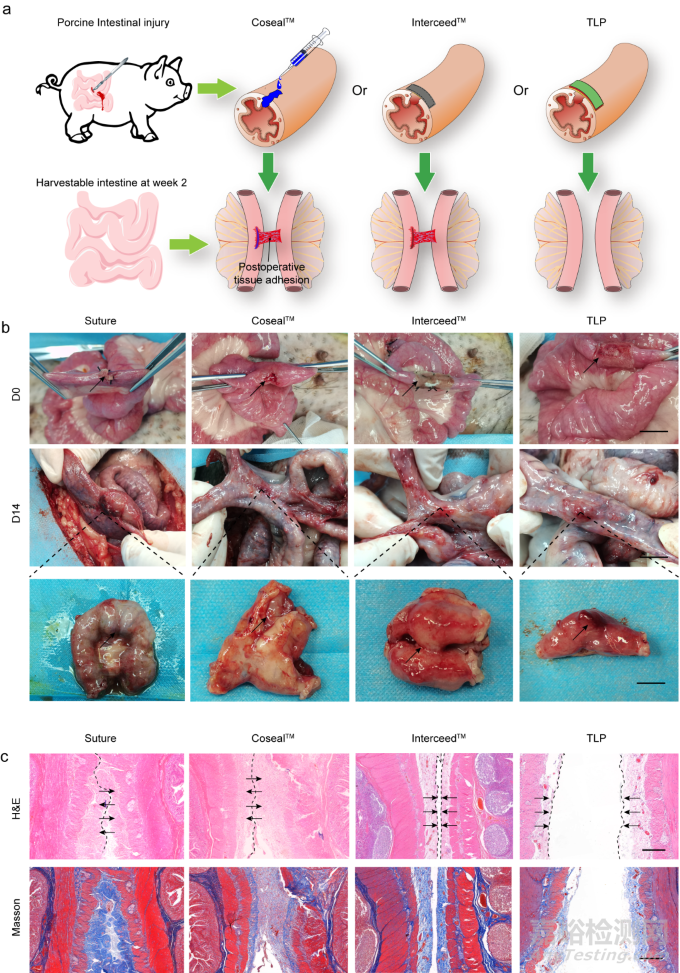 通過巴馬豬腸道損傷模型驗證了貼片TLP功能的穩(wěn)定性,術(shù)后兩周貼片TLP表現(xiàn)出較低的術(shù)后黏連評分,相對于單一功能的組織粘合劑和防黏連膜商用產(chǎn)品,貼片TLP獲得最大愈合率和最少術(shù)后組織黏連(圖6)。