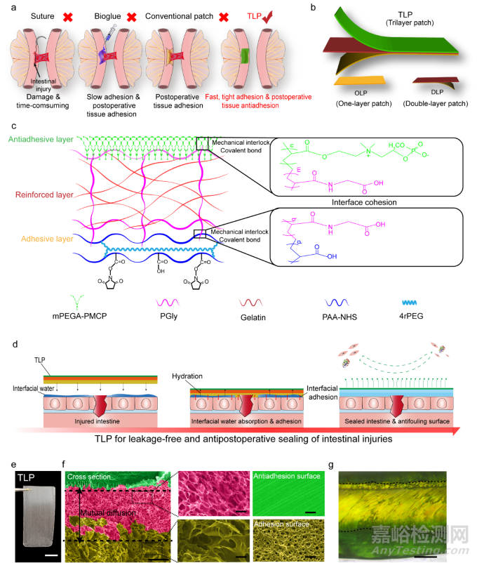 近期,華南理工大學(xué)施雪濤教授和邊黎明教授在科愛創(chuàng)辦的期刊Bioactive Materials上聯(lián)合發(fā)表研究論文:三明治結(jié)構(gòu)貼片無滲漏、無術(shù)后組織黏連修復(fù)腸道損傷。研究通過結(jié)合粘合劑、水凝膠彈性體以及兩性離子抗污涂層得到了一種結(jié)構(gòu)穩(wěn)定、兩面粘附性能截然相反的貼片,非粘附面且具備生物抗污特征,在大動物體內(nèi)成功證實了防術(shù)后黏連效果優(yōu)于商業(yè)化防黏連膜產(chǎn)品。