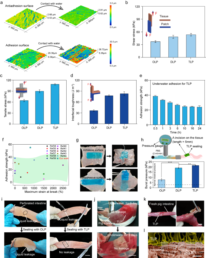 截然相反的兩面功能互不影響,粘附面在親水后表面粗糙度顯著增大,朝向有利于組織粘附的拓撲結(jié)構(gòu)變化,而背面親水后更加光滑,趨向于抗組織粘附、抗生物污染形貌特征變化,在體外證明了單面粘附貼片水下封堵腸損傷5天未發(fā)生腸泄漏(圖2)。