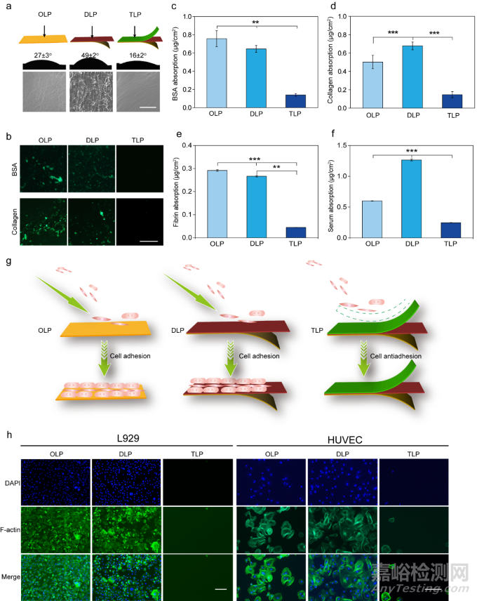 貼片TLP抗粘附面呈現(xiàn)了致密的微觀結(jié)構(gòu)和強親水能力,對纖維蛋白、血清白蛋白等多種特異性蛋白的粘附率均低于0.2 μg/cm2,對大鼠成纖維細胞和血管內(nèi)皮細胞具有顯著抗粘附效果(圖3)。