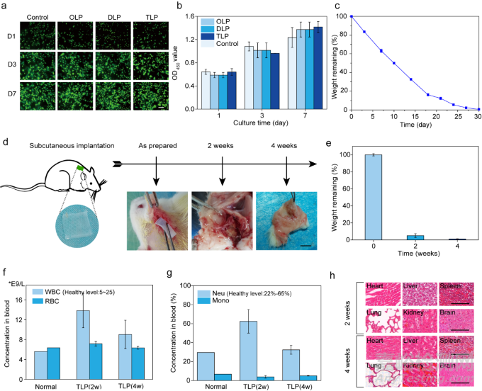 貼片TLP具有良好的細胞相容性,植入大鼠皮下四周,貼片為觀察到殘留,密切監(jiān)測大鼠血常規(guī)變化,未觀察到明顯的血液毒性或者炎癥,通過HE切片觀察到降解產(chǎn)物未對大鼠心、肝、脾、肺、腎、腦器官造成器官毒性或者病變(圖4)。