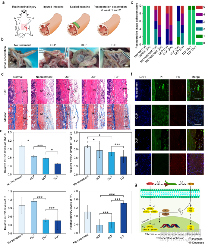 體內(nèi)大鼠腸道損傷修復(fù)模型中,貼片TLP在術(shù)后兩周獲得了最大傷口愈合率修復(fù)和最低術(shù)后組織黏連評分,病理切片分析表明貼片TLP封堵腸道后兩周纖溶蛋白激活酶的表達水平高于纖溶蛋白激活酶抑制劑,TNF-α和TGF-1β的基因表達下調(diào),結(jié)果表明TLP能通過抑制TNG-α介導(dǎo)的炎癥通路和TGF-1β介導(dǎo)的纖維化通路降低術(shù)后組織黏連程度(圖5)。