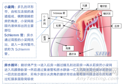 青光眼是全球首位不可逆性致盲眼病,是一組以視神經(jīng)進(jìn)行性損害為特征的眼病,其重要的因素之一是眼壓(Intraocular Pressure,IOP)的相對(duì)升高。眼壓正常值平均范圍為11~21mmHg,升高的眼壓會(huì)造成軸突損傷,或直接神經(jīng)壓迫或減少血供,軸突的損傷造成了神經(jīng)節(jié)細(xì)胞死亡,表現(xiàn)為視神經(jīng)萎縮和視野缺損。IOP升高是導(dǎo)致視力喪失的一個(gè)主要危險(xiǎn)因素,并且是唯一可控的因素。造成眼壓升高的病因有2種,一是房水排除受阻,二是房水生成過(guò)多。大部分青光眼是由于房水引流受阻引起的眼壓升高導(dǎo)致的。房水由睫狀體生成,大部分通過(guò)虹膜和角膜連接處形成的前房角排出眼外。主要通過(guò)小梁網(wǎng)和Schlemm管引流。
