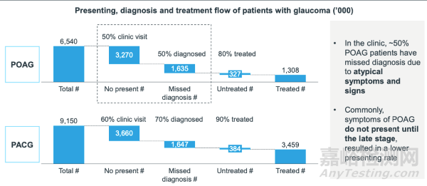 原發(fā)性開角型青光眼早期無(wú)癥狀,當(dāng)病變進(jìn)展到一定程度后,會(huì)出現(xiàn)視力模糊、頭痛和眼脹等癥狀;由于起病隱匿,50%的開角型青光眼患者不會(huì)去門診就診。據(jù)統(tǒng)計(jì),就診患者有50%患者會(huì)被誤診,診斷患者有80%患者會(huì)選擇治療。原發(fā)性閉角型青光眼同樣是早期無(wú)癥狀,一旦出現(xiàn)虹膜堵塞房角,房水不能外流,會(huì)出現(xiàn)急性癥狀,因此就診率也僅為60%。患者疾病意識(shí)缺乏、醫(yī)生早期診斷技巧缺乏積累、眼壓輔助診斷等消費(fèi)級(jí)電子醫(yī)療產(chǎn)品缺失,導(dǎo)致誤診率較高。