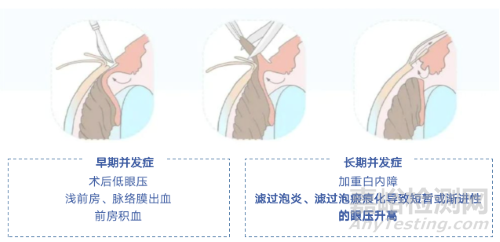TE被證明是有效、安全且可重復(fù)的。然而仍有15%-30%患者手術(shù)失敗,小梁切除術(shù)創(chuàng)傷性大,并發(fā)癥多,術(shù)后濾過(guò)道瘢痕形成影響濾過(guò)道的房水引流通常往往是失敗的主要原因。早期并發(fā)癥如術(shù)后低眼壓、淺前房、脈絡(luò)膜出血,前房積血等,長(zhǎng)期階段如加重白內(nèi)障,濾過(guò)泡炎、濾過(guò)泡瘢痕化導(dǎo)致短暫或漸進(jìn)性的眼壓升高,并且部分患者只有術(shù)后頻繁的行濾過(guò)泡抗纖維化藥物注射才能保證手術(shù)的成功。