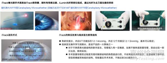 目前國(guó)內(nèi)青光跟MIGS相關(guān)的臨時(shí)植入的器械首家上市的產(chǎn)品是由EllexScience公司生產(chǎn)的iTrack導(dǎo)管(iTrack光纖導(dǎo)管(微導(dǎo)管)360°schlemm管切開術(shù)),已經(jīng)在國(guó)內(nèi)進(jìn)行推廣,目前市場(chǎng)價(jià)格為1.8萬(wàn)元/根,市場(chǎng)占有率低。iTrack適用于中早期POAG患者,一般不適用于慢性青光眼,患者的遠(yuǎn)端流出系統(tǒng)必須保證完整;主要操作方式是通過(guò)內(nèi)路法,將導(dǎo)光纖維管插入到Schlemm和小梁網(wǎng)中,將Schlemm管內(nèi)壁及小梁網(wǎng)360°切開,進(jìn)行360度的擴(kuò)張,從而增加房水的引流。