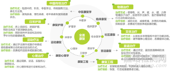 康復(fù)醫(yī)學(xué)覆蓋病種領(lǐng)域廣泛,終端受益者主要涵蓋了老年人、殘疾人、兒童、疾病人群、產(chǎn)后女性等群體,是一門(mén)多元交叉的學(xué)科,因此,需要多學(xué)科配合聯(lián)動(dòng),并不斷與相關(guān)學(xué)科結(jié)合產(chǎn)生新的亞學(xué)科從而實(shí)現(xiàn)全面康復(fù)的目標(biāo),具有極強(qiáng)的綜合性。康復(fù)醫(yī)學(xué)從功能評(píng)估、康復(fù)目標(biāo)的擬訂、治療訓(xùn)練、復(fù)查、修訂方案到最后的病情總結(jié),串聯(lián)了患者康復(fù)的全過(guò)程。其治療手段多樣,包括物理治療、運(yùn)動(dòng)療法、言語(yǔ)治療、心理治療等,致力于幫助患者恢復(fù)生活能力,減輕家庭和社會(huì)負(fù)擔(dān),重返社會(huì)并參與社會(huì)經(jīng)濟(jì)生產(chǎn),實(shí)現(xiàn)全面康復(fù)的目標(biāo)。