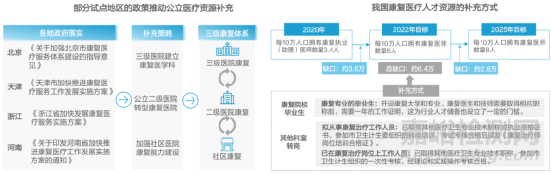 試點(diǎn)省市發(fā)布實(shí)施方案,以公立為主,逐步補(bǔ)充亞急性期、慢性期康復(fù)機(jī)構(gòu)和人才資源。試點(diǎn)地區(qū)積極發(fā)布較為具體的實(shí)施方案,補(bǔ)充公立康復(fù)資源,推動(dòng)康復(fù)科建設(shè)與二級(jí)醫(yī)院轉(zhuǎn)型,以逐步補(bǔ)充亞急性期康復(fù)機(jī)構(gòu),以及穩(wěn)定期康復(fù)資源,完善三級(jí)康復(fù)醫(yī)療體系的基礎(chǔ)建設(shè)。鼓勵(lì)院校開(kāi)設(shè)康復(fù)專(zhuān)業(yè),要求衛(wèi)健委建立康復(fù)人才培養(yǎng)和轉(zhuǎn)崗等機(jī)制以補(bǔ)充人才。