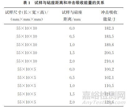 試樣缺口面應該與砧座面緊密貼合,沖擊刀刃沿著缺口對面向缺口背面打擊,試樣缺口對稱面偏離兩砧座間的中點距離應不大于0.5mm,否則擺錘高速打擊試樣時會產生緩沖,造成沖擊試驗結果失真,試樣與砧座距離和沖擊吸收能量的關系如表1所示。
