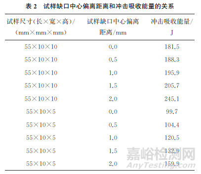 試樣缺口中心需與沖擊刀刃中心重合,否則缺口處裂紋的形成及擴展會變得困難,造成沖擊試驗結果失真,試樣缺口中心偏離距離和沖擊吸收能量的關系如表2所示。
