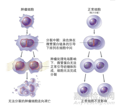 癌細(xì)胞是一群快速有絲分裂,不受控制惡性增殖的細(xì)胞。在癌細(xì)胞分裂的中期,電場(chǎng)影響微管蛋白聚集成簇,阻止紡錘體形成,導(dǎo)致染色體無法正常分離;在癌細(xì)胞分裂的末期,電場(chǎng)將電荷推向分裂細(xì)胞的頸部,破壞癌細(xì)胞結(jié)構(gòu)。這兩種作用機(jī)制導(dǎo)致的最終結(jié)果都是抑制癌細(xì)胞正常分裂,最終出現(xiàn)表面膜起泡,癌細(xì)胞破裂,死亡。
