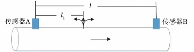 當(dāng)管道發(fā)生泄漏時(shí),管道的上游傳感器和下游傳感器分別檢測(cè)到包含泄漏信息的聲波,可以根據(jù)時(shí)延定位公式計(jì)算出泄漏點(diǎn)的位置,原理如圖4所示。