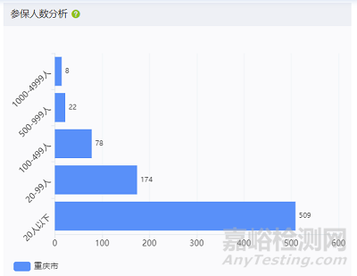 從企業(yè)參保人數(shù)分析看,重慶市的生物醫(yī)藥產(chǎn)業(yè)企業(yè),參保人數(shù)在1000-4999人的有8家,500-999人的有22家,100-499人的有78家,20-99人的有174家。20人以下的有509家。