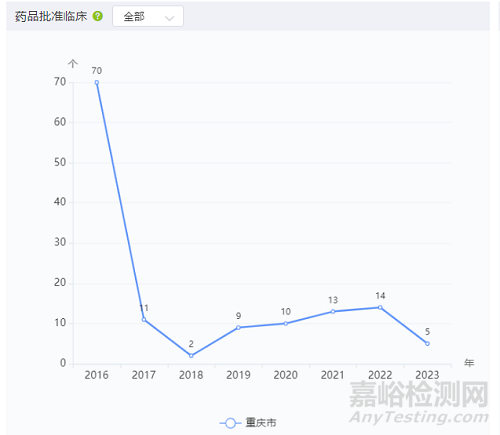 從藥品申請臨床看,2016年至2023年,重慶市的藥品申請臨床數(shù)量總數(shù)為64個(gè)。對2016年-2023年數(shù)據(jù)求和,在全國所有城市中,重慶市排 17 名。