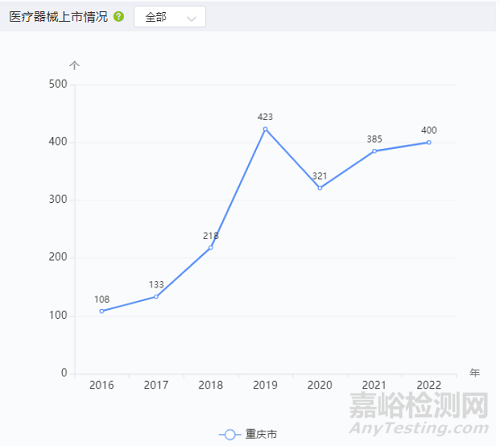 從醫(yī)療器械上市情況看,2016年至2023年,重慶市的醫(yī)療器械上市總數(shù)為1988個(gè)。對2016年-2023年數(shù)據(jù)求和,在全國所有城市中,重慶市排 11 名。