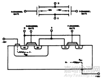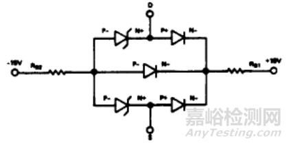 圖1是一個(gè)典型CMOS輸出開關(guān)單元的電路圖及截面圖。從不同單元和區(qū)域之間的連接關(guān)系中,我們可以畫出一個(gè)等效二極管電路圖(圖2)。如果在S端或D端的模擬輸人電壓超過(guò)電源電壓。