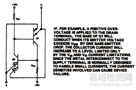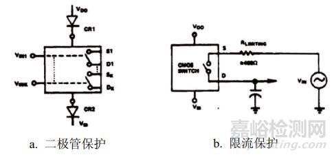 過(guò)壓能引起過(guò)大的電流和金屬化問(wèn)題。通常,運(yùn)算放大器的輸出作為S端或D端的電壓源,因此電流不能大于運(yùn)算放大器直流輸出電流的限值。然而,瞬態(tài)感應(yīng)電流仍有可能破壞CMOS器件;因此,有必要進(jìn)行保護(hù)。