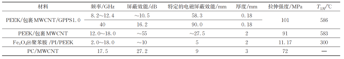 用于寬帶電磁干擾屏蔽時,薄膜表現(xiàn)出高熱穩(wěn)定性(5%質量損失時分解溫度T5%為586℃)和良好的力學性能(PEEK/聚醚砜包覆MWCNTs質量比為91∶9時,拉伸強度為101MPa),優(yōu)于先前報道的其他電磁屏蔽薄膜(表1)