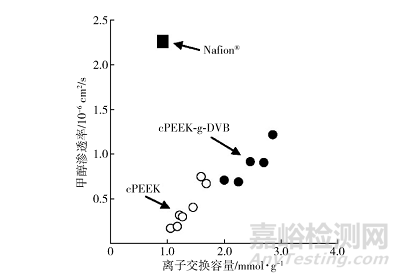 圖2 cPEEK和cPEEK-g-DVB電解質膜的甲醇滲透率與離子交換容量的關系