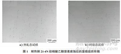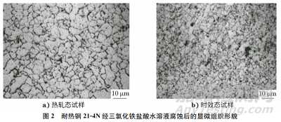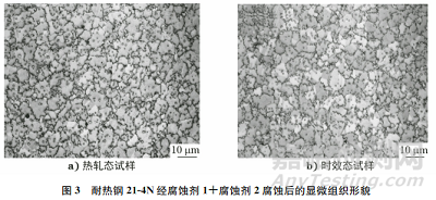 采用5g FeCl3+50mL HCl+100mL H2O腐蝕劑與10g CuSO4+15mL H2SO4+100mL HCl+5mL C3H8O3腐蝕劑配合使用,在室溫下對(duì)熱軋態(tài)和時(shí)效態(tài)耐熱鋼21-4N進(jìn)行化學(xué)腐蝕,可獲得晶界清晰、孿晶完整、腐蝕效果良好的顯微組織。