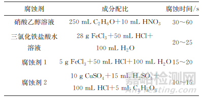 試驗(yàn)所用腐蝕劑的成分配比以及腐蝕時(shí)間如表1所示。