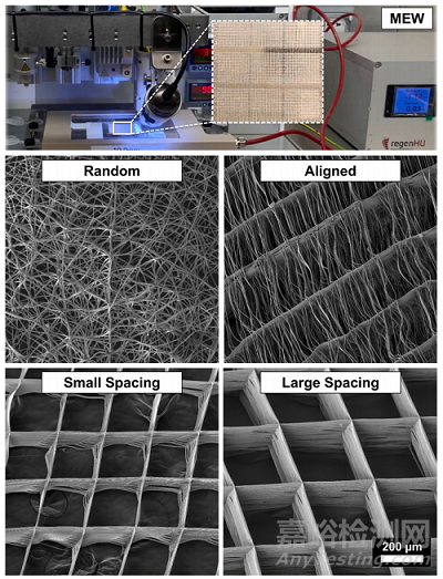 Fig. 1. Melt electrowriting (MEW) setup to fabricatefibrous scaffolds of distinct fiber configuration andhighly-ordered architectures. Representative SEMimages of the various MEW PCL scaffolds show meltelectrowritten polymeric (i.e., poly(ε-caprolactone)scaffolds with tissue-specific attributes such as fibermorphology (random vs. aligned) and highly-ordered(0?/90? crosshatch pattern) architecture with distinctstrand spacings (small 250 μm and large 500 μm).Overall, the as-produced scaffolds display fiber diameters (in μm) ranging from 2.3 ± 0.1, 2.5 ± 0.2,2.6 ± 0.3 and 4.2 ± 0.7 and porosity of 52.9%,91.7%, 85.5 and 30.9% in aligned, large and smallstrand spacing to randomly-deposited fibers,respectively.