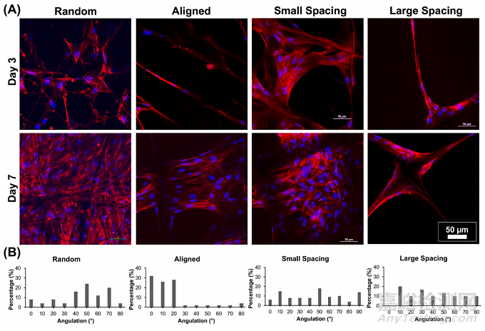 通過SEM(圖2B)和熒光(phalloidin染色)成像(圖3),可以明顯地看到與各種MEW PCL支架誘導(dǎo)的接觸引導(dǎo)相關(guān)的hPDLSCs形態(tài)的直接變化。具有平行沉積纖維的高定向(對(duì)齊)支架允許hPDLSCs平行于纖維的長(zhǎng)軸方向?qū)R(圖2B),而在隨機(jī)和高度有序的支架(即小和大鏈間距)中,hPDLSCs表現(xiàn)出多邊形形狀,細(xì)胞骨架多方向延伸,取向混亂。因此,hPDLSCs在對(duì)齊的纖維上培養(yǎng)時(shí)采用了典型的紡錘形形態(tài),這是以前在人類成纖維細(xì)胞中觀察到的特征。