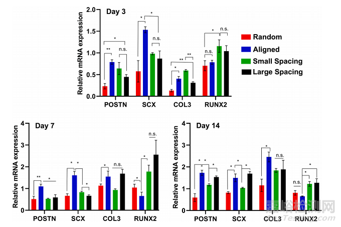 為了評(píng)估hPDLSCs在工程支架上的分化潛力,在缺乏分化因子的情況下,評(píng)估了特異性編碼韌帶生成(骨膜蛋白[POSTN]、鞏膜[SXC]和膠原III [COL3])和成骨(runt相關(guān)轉(zhuǎn)錄因子2 [RUNX2])的基因表達(dá)(圖4)。在第3、7和14天,所選的韌帶生成基因(即骨膜蛋白、鞏膜和Col3)的mRNA水平在纖維對(duì)齊的支架中顯著升高,而成骨標(biāo)記物(Runx2)在橫線0/90?250 μm和500 μm鏈間距的支架中顯著升高。