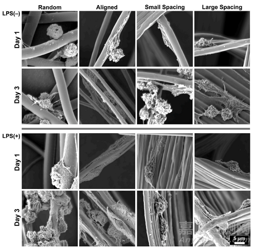 研究通過控制支架結(jié)構(gòu)(鏈間距)和纖維結(jié)構(gòu)(對(duì)齊vs隨機(jī)),將RAW 264.7細(xì)胞(巨噬細(xì)胞)接種在確定的支架上,在培養(yǎng)基中加入的炎癥標(biāo)志物表達(dá)誘導(dǎo)物——大腸桿菌脂多糖(LPS),通過qPCR和ELISA檢測(cè)巨噬細(xì)胞表型標(biāo)志物的表達(dá)變化。在隨機(jī)定向的纖維支架上培養(yǎng)的RAW 264.7細(xì)胞能夠在第1天保持圓形表型,而當(dāng)巨噬細(xì)胞在對(duì)齊的支架上培養(yǎng)時(shí),細(xì)胞伸長(zhǎng)更為突出(圖5)。同時(shí),在所有測(cè)試支架上,未受到刺激和LPS刺激的RAW 264.7細(xì)胞的細(xì)胞擴(kuò)散和伸長(zhǎng)保持相當(dāng)(圖5)。值得注意的是,即使在炎癥刺激的環(huán)境中,纖維排列和鏈間距傾向于影響巨噬細(xì)胞伸長(zhǎng),這被認(rèn)為是促進(jìn)表型標(biāo)記物從M1到M2表達(dá)的變化。