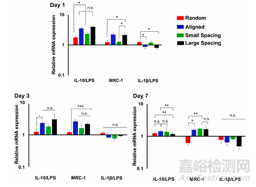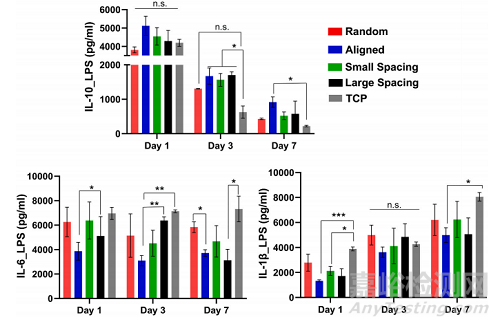 LPS刺激巨噬細(xì)胞在不同纖維取向和結(jié)構(gòu)(鏈間距)支架上的細(xì)胞因子釋放。使用在不同支架上培養(yǎng)巨噬細(xì)胞后提取的上清液測(cè)量釋放的細(xì)胞因子,并將其與對(duì)照TCP進(jìn)行7天的比較(圖6)。