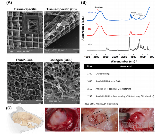 為了闡明組織特異性屬性的重要性,我們?cè)敿?xì)制作了一種新型納米結(jié)構(gòu)氟化磷酸鈣(F/CaP) MEW PCL支架。所制備的組織特異性支架具有明顯的纖維取向(圖8A)。特別是,SEM分析表明,設(shè)計(jì)的PDL區(qū)域在~200 μm高度與原始PDL空間相似,而骨區(qū)域在~800 μm高度高度具有高度有序(0/90?交叉鋸齒)和多孔(500 μm鏈間距)。FTIR光譜數(shù)據(jù)顯示(圖8B),F(xiàn)/ cap涂層支架中~565 cm和~960 cm處與磷酸鹽相關(guān)的化學(xué)官能團(tuán),而灌注膠原蛋白的支架和膠原蛋白也顯示了酰胺基團(tuán),證實(shí)了膠原蛋白在MEW支架內(nèi)的成功滲透。掃描電鏡(SEM)和紅外光譜(FTIR)分析表明,在不改變所使用的基底材料成分的情況下,可以有效地制備膠原灌注支架。