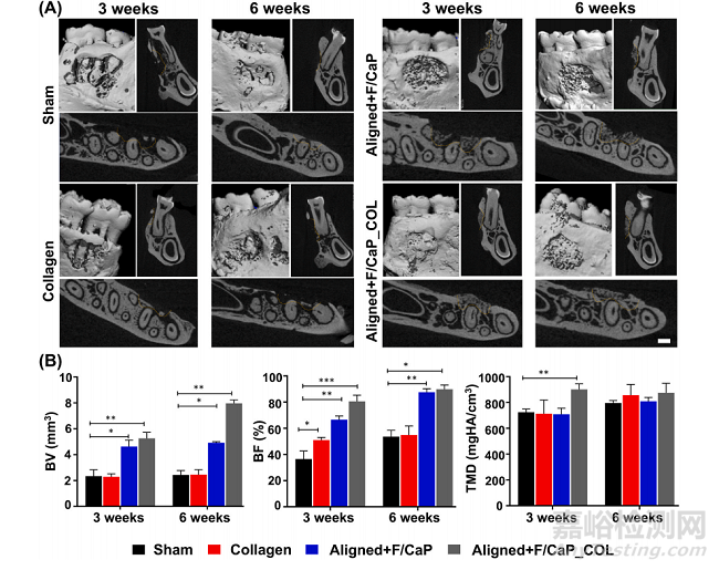 利用已建立的大鼠下頜骨牙周開窗缺損模型,對(duì)工程纖維支架支持新組織沉積的潛力進(jìn)行評(píng)估(圖8C)。根據(jù)我們的組織學(xué)和免疫組化結(jié)果,制備的帶式支架的成分(即F/ CaP涂層)和結(jié)構(gòu)組織(纖維排列)導(dǎo)致牙槽骨和PDL同時(shí)再生(圖9)。microCT分析顯示,在所研究的支架組之間,缺損部位的骨形成存在顯著差異(圖9A)。術(shù)后3周和6周,不同組骨容量、骨填充和組織礦物密度的μCT評(píng)估。與對(duì)照組和非包膜組相比,包膜(F/CaP)組和膠原蛋白的存在進(jìn)一步顯示了骨體積和骨填充的顯著差異(圖9B)。