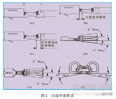 壓接出頭長度數(shù)值由端子本身特點(diǎn)決定,不同規(guī)格的端子對出頭長度的數(shù)值要求不同,不同生產(chǎn)廠商設(shè)計(jì)的端子對出頭長度要求也不同。要兼顧端子的規(guī)格來確定端子的壓接出頭長度,小規(guī)格的端子壓接小平方的導(dǎo)線時(shí)出頭長度短一些,大規(guī)格的端子壓接大平方的導(dǎo)線時(shí)壓接出頭長度相對長一些。出頭長度一般在0.5-1.0mm為宜。但不同的廠家有不同的要求,如DELPHI要求出頭長度為0.5-1.0mm,YAZAKI要求出頭0.1-1.0mm,AMP要求出頭長度為0.5-1.0mm,部分較精密的端子為0.13-0.51mm。MOLEX要求出頭長度為可見到一倍導(dǎo)線線芯外徑數(shù)值且最大不能延伸到結(jié)合區(qū)中;KET要求出頭長度0-2.0mm,JST要求出頭長度必須可見,如圖4(b)所示。