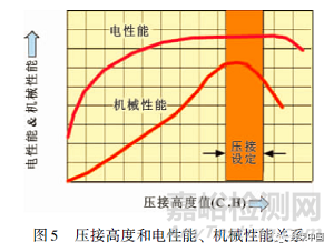 研究表明,在刀片確定的情況下,壓接高度與電性能和機(jī)械性能有如圖5所示的關(guān)系,可以看出,隨著壓接高度的增大,電性能和機(jī)械性能并不是一直在增大,在某一個(gè)區(qū)域,電性能和機(jī)械性能達(dá)到最優(yōu),之后又逐漸下降。