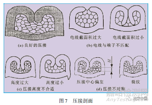 (1) 圖7(a)是理想的壓接剖面。其特點(diǎn)是壓接翼封閉、壓接翼對稱、所有的芯線變形、壓接翼未碰壁或觸底、端子材料無裂紋、毛刺適中。這樣由于電線芯之間沒有間隙,空氣不易進(jìn)入,避免了由于電線芯表面氧化或電線芯能接觸到空氣中的酸性物質(zhì)而引起的接觸不良現(xiàn)象。