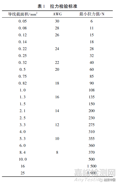 線束端子壓接最普遍、直觀的質(zhì)量檢驗(yàn)方法是拉力檢查。對不同電線截面積與不同規(guī)格接線端子壓接后的拉力檢驗(yàn)標(biāo)準(zhǔn)如表1所示。