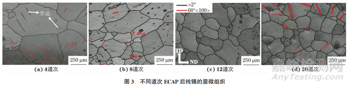 由圖3可以看出,隨著ECAP道次的不斷增加,純錫的晶粒明顯細(xì)化,尺寸分布逐漸均勻。4道次ECAP后,純錫的組織仍是粗大的晶粒,平均晶粒尺寸為850μm,原始鍛態(tài)的粗晶變形不明顯,變形晶粒內(nèi)部出現(xiàn)了一定量的片層孿晶,晶粒細(xì)化效果不明顯。8道次ECAP后,晶粒細(xì)化效果顯著提高,組織中很難看到較粗大的原始晶粒,平均晶粒尺寸為265μm。經(jīng)過(guò)12道次ECAP后,晶粒進(jìn)一步細(xì)化,細(xì)晶粒排列沒(méi)有方向性,此時(shí)細(xì)化效果明顯減弱,平均晶粒尺寸為165μm,但晶粒尺寸分布不均勻,混晶組織未完全轉(zhuǎn)變?yōu)榧?xì)晶組織。20道次 ECAP后,晶粒的平均尺寸為150μm,雖與12道次ECAP后的晶粒尺寸相當(dāng),但晶粒尺寸分布更加均勻。12道次ECAP后,純錫組織中部分尺寸較大的晶粒內(nèi)部存在的大量滑移系開(kāi)動(dòng),成為主要的消耗應(yīng)力方式,使得大晶粒內(nèi)部的應(yīng)力較分散,且部分大晶粒的取向不利于發(fā)生孿生變形,從而抑制動(dòng)態(tài)再結(jié)晶,致使大晶粒被保留。這樣的現(xiàn)象可以通過(guò)進(jìn)行更多道次的ECAP來(lái)減弱。隨著ECAP道次的增加,動(dòng)態(tài)再結(jié)晶程度增大,晶粒尺寸分布更加均勻,但無(wú)法進(jìn)一步提升晶粒細(xì)化效果。