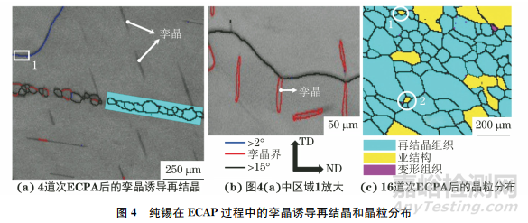 由于純錫的再結(jié)晶溫度低于室溫,所以在室溫ECAP過(guò)程中,純錫同時(shí)發(fā)生加工硬化和回復(fù)、再結(jié)晶。由圖4可以看出,4道次ECAP后大晶粒內(nèi)部產(chǎn)生了不完全再結(jié)晶條帶狀組織,同時(shí)由變形累積的大應(yīng)變使粗大晶粒局部應(yīng)力集中加劇,并達(dá)到產(chǎn)生孿生的臨界剪切應(yīng)力,從而促進(jìn)孿晶的形成;這些孿晶片層在后續(xù)的擠壓變形過(guò)程中又成為動(dòng)態(tài)再結(jié)晶的有效形核點(diǎn)。隨著ECAP道次的增多,孿晶片層為釋放其內(nèi)應(yīng)力而產(chǎn)生非均勻晶核,發(fā)生明顯的動(dòng)態(tài)再結(jié)晶,使變形孿晶逐漸被具有大角度的再結(jié)晶小晶粒所取代,最終形成與孿晶片層形貌相似的再結(jié)晶變形帶組織。這是由于在變形過(guò)程中位錯(cuò)通過(guò)有效的動(dòng)態(tài)回復(fù)作用而重新排列,形成了具有小角度晶界的胞狀或亞晶組織,并在持續(xù)的ECAP過(guò)程中通過(guò)不斷吸收位錯(cuò)而逐漸演化為大角度晶界;位錯(cuò)在沿著力軸的方向上不斷運(yùn)動(dòng),在垂直于力軸方向上沿著再結(jié)晶組織向兩邊不斷增殖,使再結(jié)晶條帶的邊界不斷伸長(zhǎng)而形成穿晶再結(jié)晶鏈狀組織,導(dǎo)致原始粗大晶粒被分割,從而形成均勻細(xì)化的晶粒。在ECAP過(guò)程中純錫變形區(qū)的晶粒細(xì)化機(jī)制是在孿晶片層內(nèi)部由高應(yīng)變引發(fā)的連續(xù)動(dòng)態(tài)再結(jié)晶;而非變形區(qū)域在熱作用下持續(xù)發(fā)生亞動(dòng)態(tài)或靜態(tài)再結(jié)晶行為。因此,經(jīng)16道次ECAP后純錫出現(xiàn)動(dòng)態(tài)再結(jié)晶晶粒(圖中晶粒1和2)、靜態(tài)再結(jié)晶晶粒(圖中藍(lán)色晶粒)以及未發(fā)生再結(jié)晶的原始晶粒(圖中紅色晶粒和其他黃色晶粒)共存的混晶現(xiàn)象。
