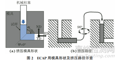 試驗(yàn)材料為在實(shí)驗(yàn)室進(jìn)行熔煉,經(jīng)自由鍛造、反復(fù)鐓拔得到的純度為99.99%的純錫鍛造板材,其取向成像圖如圖1所示,可以看出鍛態(tài)純錫的晶粒尺寸呈現(xiàn)較大的不均勻性,存在粒徑為1700μm左右的粗大晶粒,也存在粒徑為30μm左右的小晶粒,整體為混晶組織。選用如圖2(a)所示的模具進(jìn)行ECAP,其內(nèi)模具拐角為90°,模具圓心角為0°,計(jì)算得到的等效應(yīng)變?yōu)?.155。在純錫鍛造板材上切取尺寸為?8mm×60mm的圓棒狀試樣,在模具和試樣上噴涂MoS2潤(rùn)滑劑,采用萬(wàn)能力學(xué)試驗(yàn)機(jī)在室溫下進(jìn)行 ECPA試驗(yàn),每道次擠壓后試樣繞其長(zhǎng)度方向軸以順時(shí)針?lè)较蛐D(zhuǎn)90°后進(jìn)入下一道次擠壓,具體的擠壓路徑如圖2(b)所示,擠壓速度為60mm·min-1,擠壓道次分別為4,8,12,16,20道次,每4道次為一個(gè)周期,使整個(gè)試樣圓周上的晶粒變形均勻。圖1中的ED表示擠壓方向,ND表示垂直向上的方向,TD表示垂直于ED-ND平面的方向。