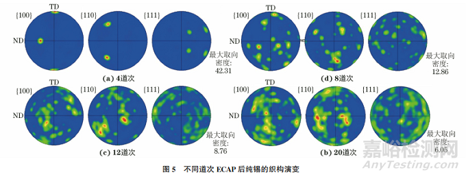 (2)隨著ECAP道次的增加,純錫的織構(gòu)強(qiáng)度和最大取向密度降低,這是由再結(jié)晶晶粒的定向形核、選擇長(zhǎng)大以及擠壓道次間的方向連續(xù)旋轉(zhuǎn)所致。