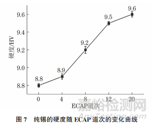 由圖7可以看出:未經(jīng)ECAP的鍛態(tài)純錫具有較低的顯微硬度,僅為8.8HV;隨著 ECAP道次的增加,顯微硬度不斷升高,20道次 ECAP后的硬度達(dá)到9.6HV;但12道次ECAP后,硬度隨ECAP道次增加的升高速率減緩,這與該道次后晶粒細(xì)化效果減弱有關(guān)。
