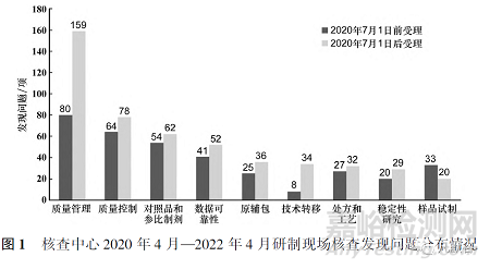 本文對核查中心2020年4月—2022年4月組織的研制現(xiàn)場核查進行分析,篩選了189個化學藥品的藥學研制現(xiàn)場核查,其中2020年7月1日前按照《總局關于調整藥品注冊受理工作的公告》(2017年第134號)集中受理品種83個,核查標準為2008年核查要點,共發(fā)現(xiàn)問題352項,平均每個品種發(fā)現(xiàn)問題4.2項;2020年7月1日后按2020年《藥品注冊管理辦法》受理的品種109個,核查標準為2021年核查要點,發(fā)現(xiàn)問題502項,平均每個品種發(fā)現(xiàn)問題4.6項。本文將189個藥學研制現(xiàn)場核查發(fā)現(xiàn)問題按照表1對應關系進行重新統(tǒng)計分析,發(fā)現(xiàn)質量管理方面的問題最為突出,其次是質量控制、對照品和參比制劑、數(shù)據(jù)可靠性方面的缺陷。對于2020年7月1日后受理品種質量管理、技術轉移兩方面的發(fā)現(xiàn)問題較2020年7月1日受理前的品種有明顯的增長趨勢。見圖1和圖2。