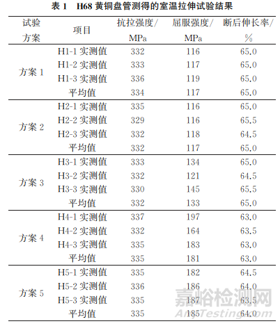 在上述黃銅盤管上截取4套(每套3支)長度為300mm的整管拉伸試樣,分別按照方案1~4進行室溫拉伸試驗;在該黃銅盤管上截取一段長度為4m的管材,在矯直機上矯直,在頭、尾切除長度約0.5m后,取一套長度為300mm的整管拉伸試樣,按照方案5進行室溫拉伸試驗。