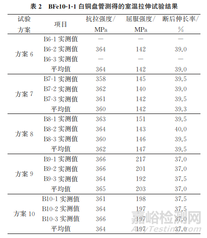 BFe10-1-1白銅盤管測得的室溫拉伸試驗結果如表2所示。由表2可知:方案6中的2個試樣拉伸斷裂在頭部,試驗失敗,原因是盤管的外圓弧屬于壁厚減薄區(qū)域,內(nèi)圓弧屬于壁厚增大區(qū)域,壓扁后容易開裂或產(chǎn)生微裂紋,使得拉伸試驗時試樣斷裂在頭部;方案7的試驗過程無異常,試驗結果穩(wěn)定;方案8測得的抗拉強度與斷后伸長率結果穩(wěn)定且無異常,與方案2的試驗結果一致性較好,屈服強度沒有出現(xiàn)個別數(shù)據(jù)增大較多的情況,原因是試樣的規(guī)格小,容易將端部掰直,避免了非夾持區(qū)域變形的情況發(fā)生;方案9測得的抗拉強度與斷后伸長率結果穩(wěn)定且無異常,但測得的屈服強度偏高,且結果不穩(wěn)定;方案10測得的抗拉強度與斷后伸長率結果穩(wěn)定且無異常,但測得的屈服強度偏高,結果穩(wěn)定。