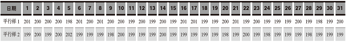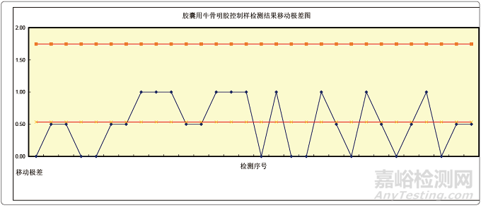 生產(chǎn)企業(yè)確定每天正常檢驗(yàn)為控制分析的頻度,即每天的膠囊用牛骨明膠控制樣品與當(dāng)天需要檢驗(yàn)的膠囊用牛骨明膠樣品一起進(jìn)行檢驗(yàn)。檢驗(yàn)結(jié)束,將控制樣品的檢驗(yàn)結(jié)果輸入到已確定項(xiàng)目的控制圖中。