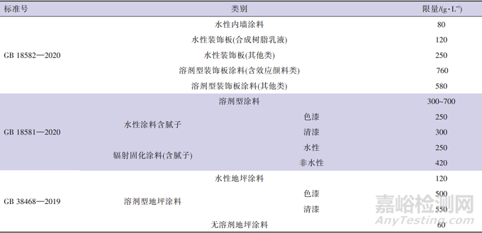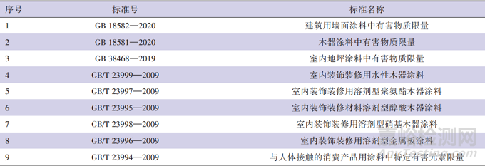 我國室內(nèi)裝飾裝修用涂料有害物質(zhì)限量標(biāo)準(zhǔn)如表1所示,主要包括室內(nèi)墻面涂料、地坪涂料、消費產(chǎn)品涂料、木器涂料等,其中GB 18581—2020、GB 18582—2020和GB 38468—2019為強制性國家標(biāo)準(zhǔn)。