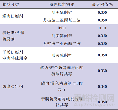 自從有機錫和滴滴涕等生物殺傷劑被禁用以來,涂料生產(chǎn)企業(yè)已經(jīng)研發(fā)了多種不同性能的生物殺傷劑,用于改善涂料的性能和延長涂料的保存時間。目前我國室內(nèi)涂料相關(guān)的標(biāo)準(zhǔn)對此類物質(zhì)無明確的限量和使用要求,相關(guān)的檢測方法也相應(yīng)缺失。歐盟在2014/312/EU指令增加了對室內(nèi)涂料中吡啶硫酮鋅、月桂胺二亞丙基二胺、IPBC、罐內(nèi)/著色防腐劑與吡啶硫酮鋅共存,干膜防腐劑與吡啶硫酮鋅共存,異噻唑啉酮類化合物等使用在涂料中用于防腐作用物質(zhì)的限制,如表5、表6、表7所示。