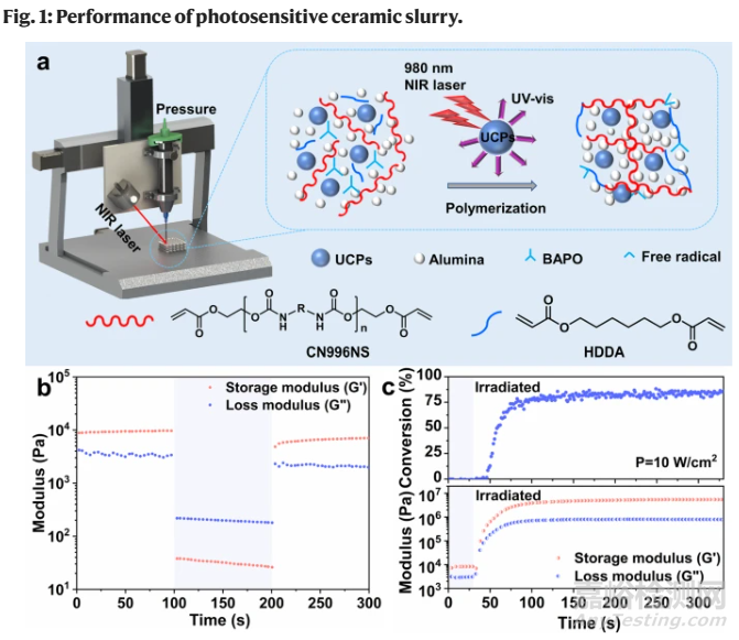 基于此,本研究團隊通過結(jié)合墨水直寫和近紅外誘導(dǎo)的上轉(zhuǎn)換粒子輔助光聚合,實現(xiàn)了多尺度和大跨度陶瓷的無支撐3D打印。該打印技術(shù)能夠?qū)崿F(xiàn)直徑從410微米到3.50毫米多尺度長絲的原位固化,并通過無支撐打印成功構(gòu)建了扭簧、三維彎曲和懸臂梁的陶瓷結(jié)構(gòu)。這種NIR-DIW的無支撐增材制造技術(shù),為陶瓷增材制造提供了更高的自由度。這項技術(shù)的關(guān)鍵不僅在于消除了典型打印過程中所需要的支撐,而且還具有許多其他優(yōu)勢,如減少打印時間、材料用量和后處理工作。相信NIR-DIW方法將被進一步拓展,在沒有支撐的情況下制造的復(fù)雜形狀陶瓷將有助于產(chǎn)生更多的創(chuàng)新和更廣泛的應(yīng)用。