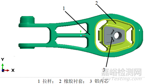 圖2中為一抗扭拉桿,拉桿大端襯套有三種不同結(jié)構(gòu),如圖3(a)、(b)、(c)所示。本計算報告分別對三款橡膠襯套 (分別稱為懸置I、II、III) 進行了有限元分析,預測了橡膠懸置在兩種工況下的疲勞壽命。圖2中給出了橡膠懸置的坐標系定義。