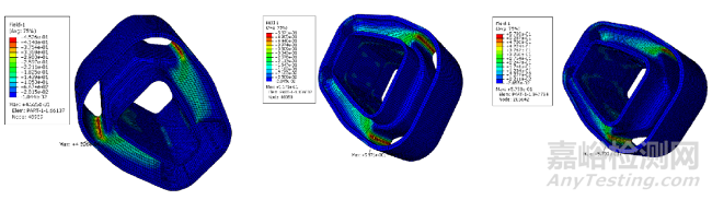 在abaqus中對以上三種結(jié)構(gòu)懸置有限元模型設(shè)置材料屬性以及分析步,設(shè)置載荷步后提交求解,進入后處理模塊提取各自的疲勞損傷參量代入公式中計算疲勞壽命次數(shù)。